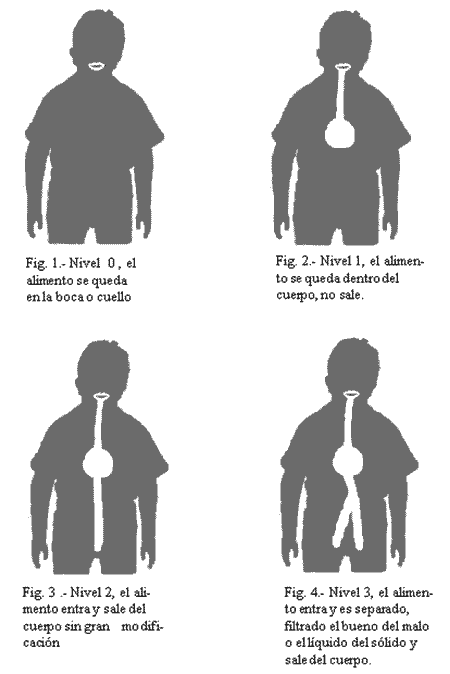 Para los alumnos de tercero, de 8 a 10 años, vemos una modificación de las ideas de tubo cerrado y abierto, si bien se apega al esquema de los alumnos de segundo grado, nivel 2, tubo abierto que agrega una variable, que es la separación simple de los alimentos, ya sea en buenos o malos o líquidos y sólidos, esto nos indica un paso en la capacidad del niño, al manejar una variable más e integrarla a su saber previo, rompiéndo su sincretismo, de ahí que el niño responda a la pregunta "¿ donde están los pepinos? " diciendo que; "todos se revuelven en el estómago, después vas al baño y sale en forma de "pipí" y a veces sale la "popó"..." o "..se va al estómago y después lo que no sirve se vá", esto se puede esquematizar :
