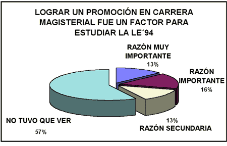 Como puede observarse, el 57% de los profesores-alumnos considera que la promoción en carrera magisterial no fue un factor determinante en su decisión de estudiar la Licenciatura en Educación plan 1994. A lo anterior cabría anotar que el 54.6% de los encuestados no está inscrito en dicho programa. Es importante tener en cuenta que, dentro de la estructura de este instrumento, no se han considerado las variables que permitan conocer o inferir si las circunstancias que dan como resultado este porcentaje se deben a que se trata de profesores-alumnos de bachillerato, motivo por el cual no pueden acceder a carrera magisterial, o a egresados cuya decisión personal haya sido no ingresar a éste.