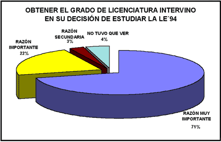 Parece que existe un marcado interés de los profesores-alumnos por obtener un mayor grado académico al que poseen. Además, un porcentaje similar (71%) considera a la actualización docente y a la obtención de conocimientos psicopedagógicos como factores que influyeron de manera muy importante en su decisión por estudiar la licenciatura.