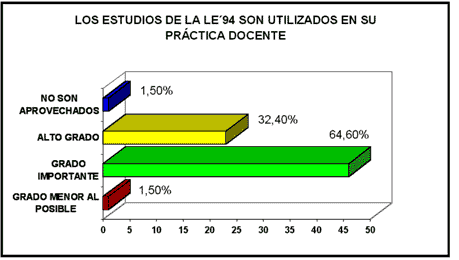 Como se puede observar, en términos generales, los profesores-alumnos consideran que los elementos conceptuales, las prácticas metodológicas, así como los contenidos revisados a lo largo de cuatro años son aprovechados en un grado importante en su labor docente cotidiana.