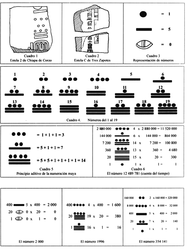 El cero de los mayas aparece en la Estela 2 de Chiapa de Corzo, estado de Chiapas (véase el cuadro 1), en un numeral que corresponde al año 35 a.C., y también en la Estela C de Tres Zapotes, estado de Veracruz (cuadro 2), en otro numeral correspondiente al año 31 a.C. (2) El mayista Sylvanus G. Morley afirmó que los sacerdotes habían ideado ese sistema de numeración cuyos valores dependen de la posición que los símbolos numéricos guardan entre sí, en una época que puede ubicarse dentro de los siglos IV ó III a.C. (3) y, por supuesto, mucho antes de que el sistema de posiciones en la numeración fuera de uso general en la Europa occidental.